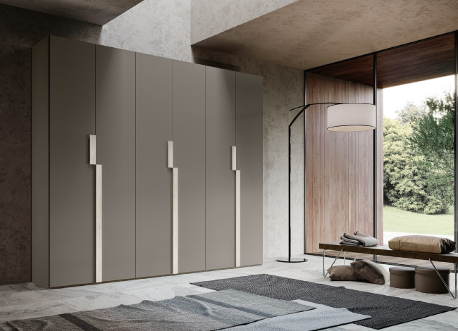 Il particolare inserto centrale di questo armadio può essere realizzato in una selezione delle finiture spatolate, materiche ed essenze, per facilitare l’abbinamento con le nuances scelte per le ante e rendere unico questo arredo così importante della camera da letto.