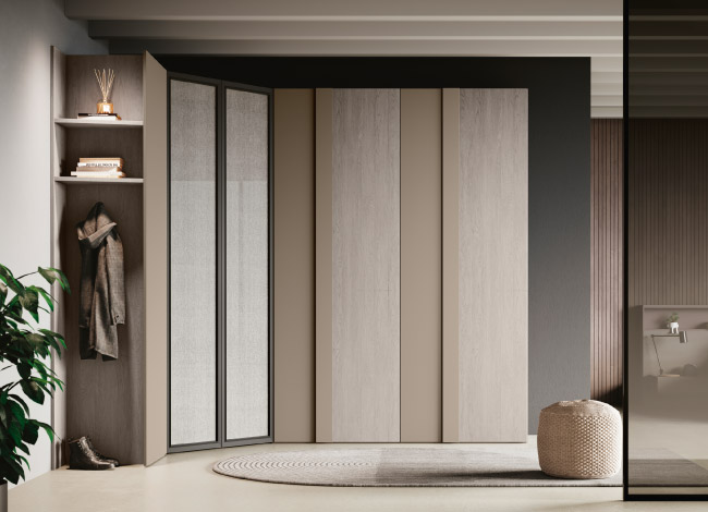 Attraverso l’inserimento degli accessori è possibile personalizzare gli spazi di un armadio in maniera intelligente ed utile alla gestione dell’oggettistica che accompagna la nostra quotidianità. Se a questi si aggiunge una scrivania estraibile, pensata per le esigenze di lavoro agile, la composizione acquisterà davvero una valenza contemporanea!