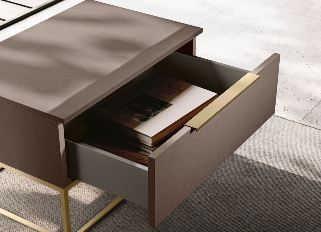 Un gruppo definito dalla leggerezza della struttura in ottone che caratterizza il comodino, il comò e il settimino.