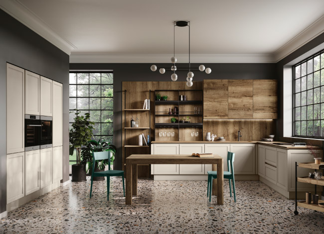 Il sapore urban si sposa con la tradizione dando vita a un design innovativo in linea col gusto contemporaneo. Le boiserie disegnano volumi architettonici come ponte di collegamento tra la zona cottura, lavaggio e la zona pranzo. Accessori come le librerie a parete diventano una soluzione funzionale per ospitare bicchieri, bottiglie, spezie e tanto altro.