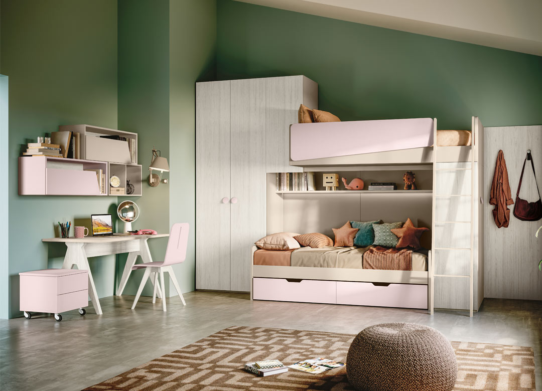 Quella che vedi in foto presenta due delle nostre finiture più richieste per arredare la cameretta: l’essenza legno Bianco Altea e il tinta unita Rosa confetto, ma le combinazioni possibili possono essere veramente tante. Scoprile in questa pagina dedicata.